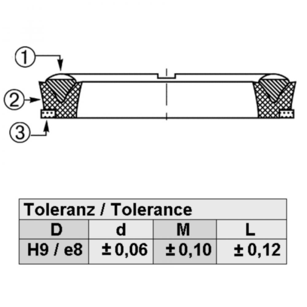 | Материал | (2) уплотнение: армированный тканью нитрильный каучук (3) кольцевая прокладка Полиформальдегид (1) опорное кольцо: Нитрильный каучук |